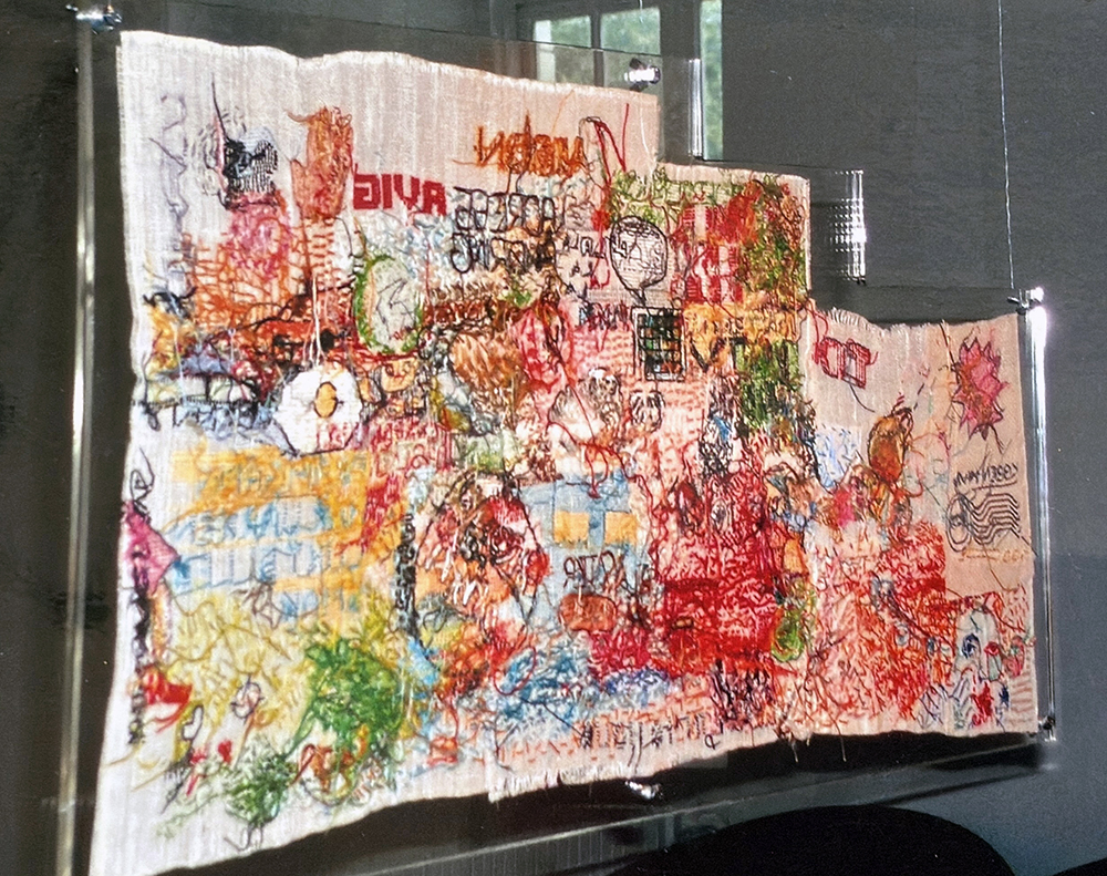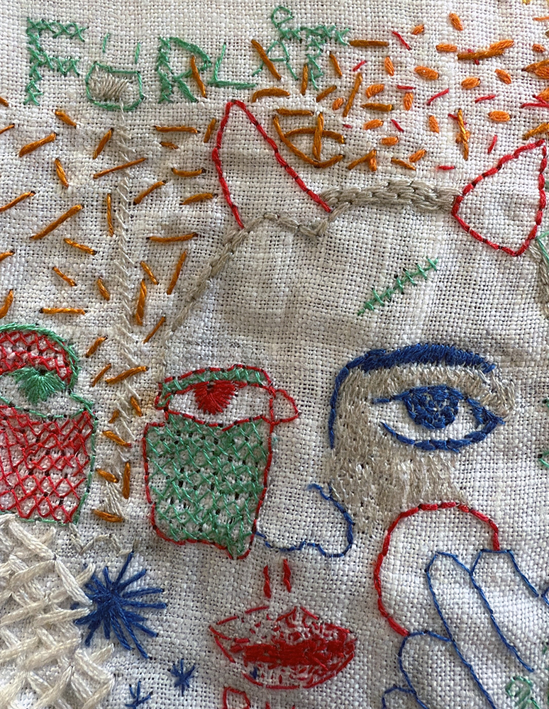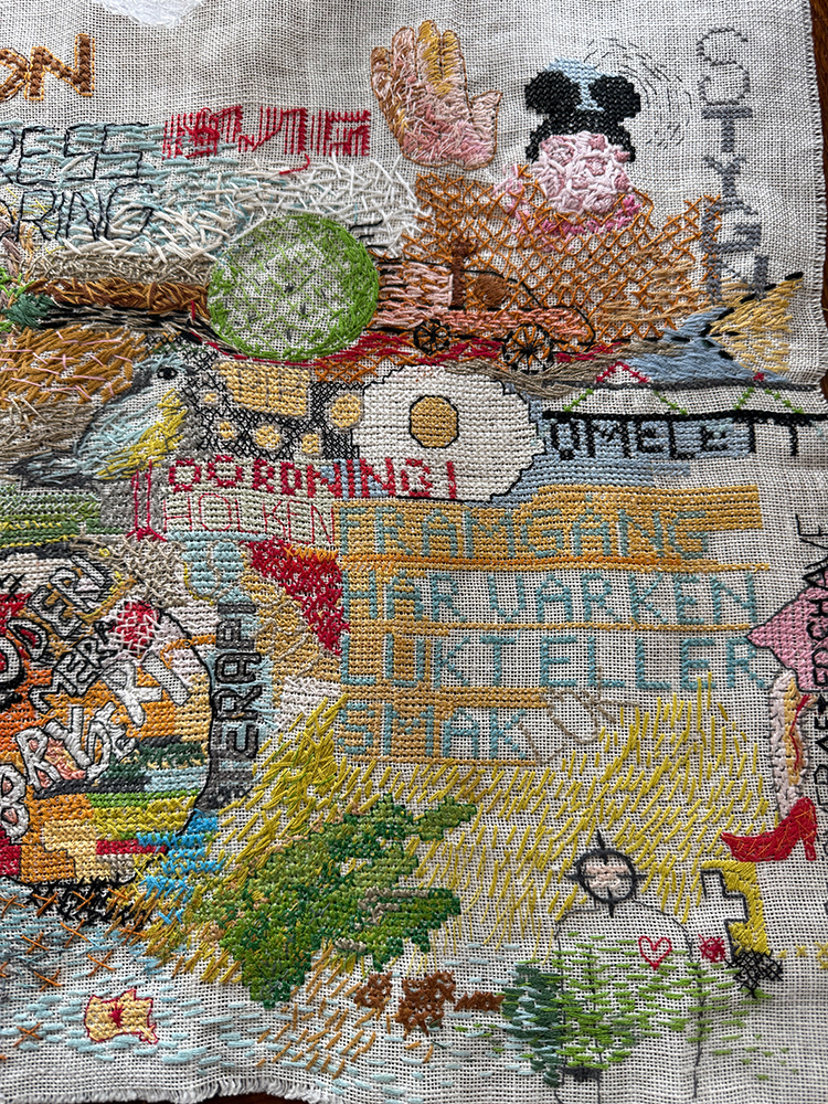 We are two artists Louise Jeppesen, Denmark and Linda Worbin, Sweden who have had a creative conversation via mail for over 25 years – an everyday work of art that began in 1998 with a 10×10 cm piece of fabric and has grown into the joint work Broderi Bryderi with a size of approximately 45 x 120 cm. During the time that we sent the embroidery back and forth between Denmark and Sweden by letter, we became more and more interested in stamps, stamps, envelopes and with the postman himself as a co-creator. We have continued to play with each other through other media and techniques, such as graphic prints, ceramics, mixed media simply having fun.